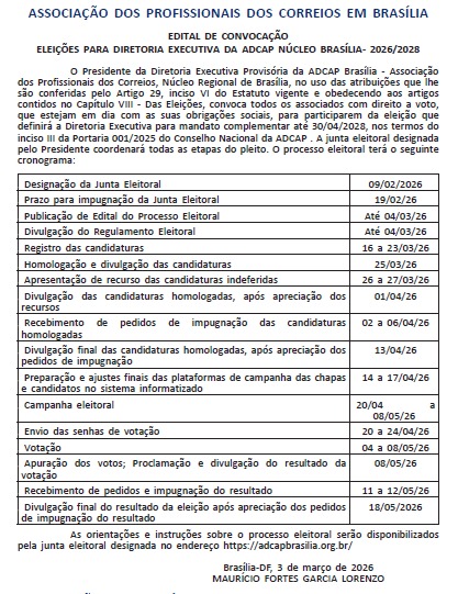 Com base no Artigo 49 do Estatuto da Associação dos Profissionais dos Correios – ADCAP, Núcleo foram designados os associados relacionados a seguir, para compor a Junta Eleitoral, encarregando-os de conduzirem o processo com vistas à Eleição de Diretoria Executiva da ADCAP Brasília, para escolha dos Dirigentes com mandato até 30 de abril de 2028, em conformidade com o inciso III da Portaria 001/2025 do Conselho Nacional da ADCAP, de 18/11/2025.